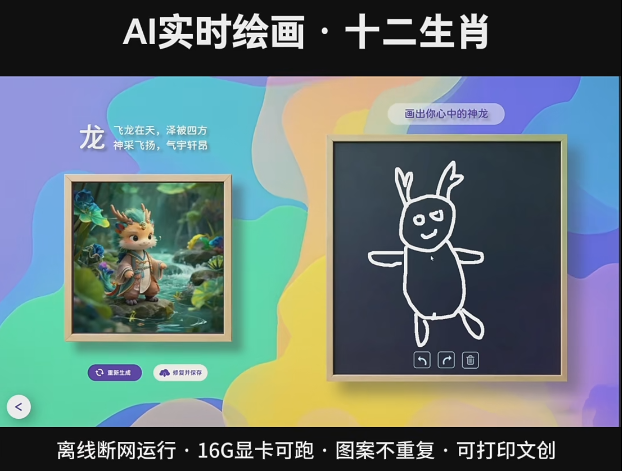 AI 智能双屏互动绘画系统,是一款双屏联动、实时生成、模型可切换的沉浸式 AI 绘画交互软件。用户在绘画屏上自由勾勒线条、涂鸦创作,系统实时捕捉笔触与画面,通过 AI 模型在展示屏上一键生成高精度艺术画作,支持多风格模型自由切换,满足不同主题、不同场景的定制化展示需求。